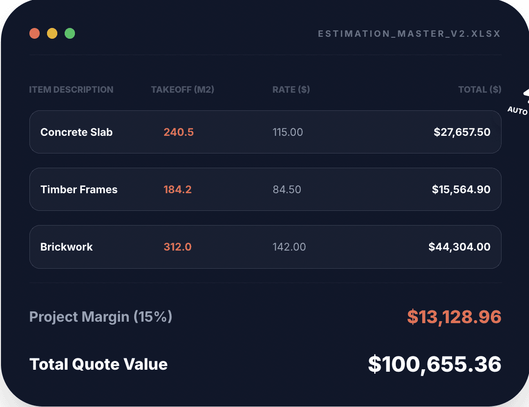 Enter your takeoff measurements directly into our pre-built Excel sheet. Watch as the formulas calculate total quantities, labor hours, and materials with 100% accuracy.